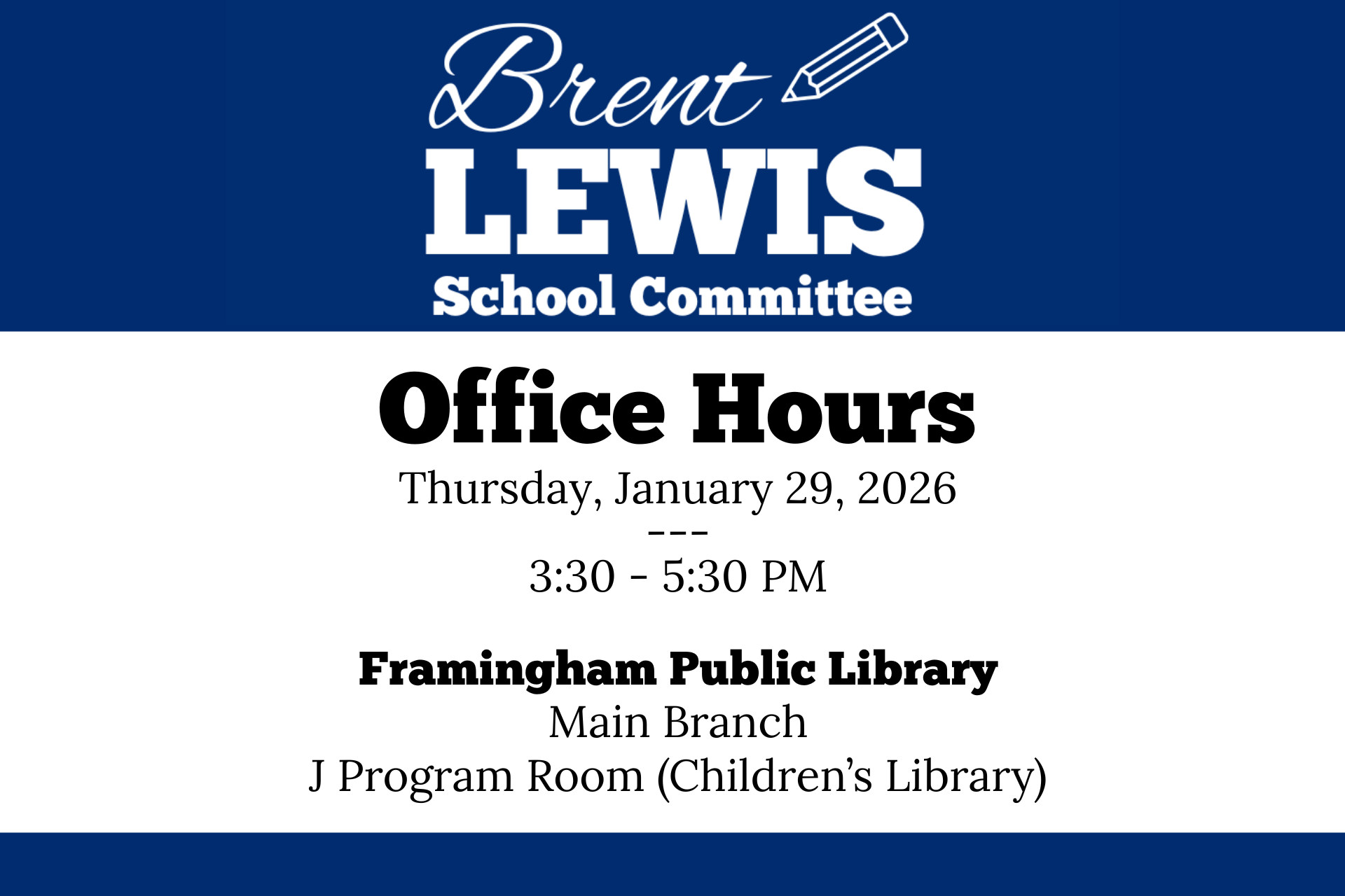 Want to talk Framingham Public Schools or have questions about the budget process? Join Brent Lewis for office hours Thursday, January 29 from 3:30-5:30 at the Main Library.